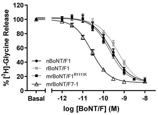 nBoNT/F1, rBoNT/F1, mrBoNT/F1R1111K and mrBoNT/F7-1 all produced concentration-dependent decreases in the release of [3H]-glycine from eSCN following BoNT intoxication (Figure 3).