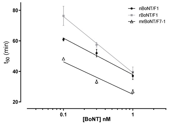 Previously, the estimated concentration to generate a t50 of 70 min for BoNT/A was 2.438 nM [25]. The data here show both recombinant sub-serotypes were also more potent than BoNT/A.