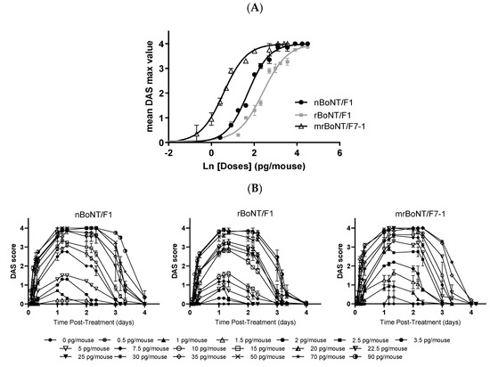 DAS assay in mice (A) Dose–response curve after intramuscular injection of nBoNT/F1, rBoNT/F1 and mrBoNT/F7-1. Fitting with a 4-parameter logistic equation with the bottom parameter constrained to zero and the top parameter constrained to 4. Each point represents the mean ± SEM of 2/3 experiments with n = 6 animals per dose. (B) DAS value time-course after injection into the gastrocnemius of mice, each point represents means of 6 values ± SEM of n = 2–3 experiments.