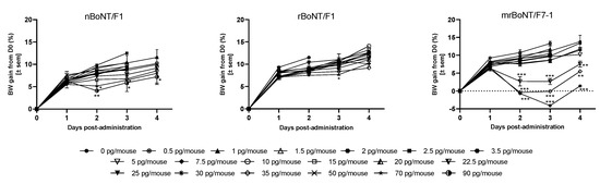 All the BoNTs affected body weight (BW) gain during the study and in a dose-related manner. From the dose of 0.5 to 15.0 pg/mouse, none of the BoNTs affected the BW gain in comparison to vehicle-treated animals. For nBoNT/F1, BW gain remained comparable until 50.0 pg/mouse, then, starting at D2 after injection, animals treated with 70.0 to 90.0 pg/mouse of nBoNT/F1 gained significantly less weight than vehicle-treated animals and this persisted until the end of the experiment (D4). In contrast, the 70 pg/mouse rBoNT/F1 treated animals transiently gained less weight than the vehicle-treated animals while no other dose treatments affected the BW gain. Finally, we observed a more pronounced change in the BW gain following treatment with mrBoNT/F7-1. From 22.5 pg/mouse, mrBoNT/F7-1 treated animals significantly lost weight between D2 and D3 and started to recover at D4 (Figure 7).
