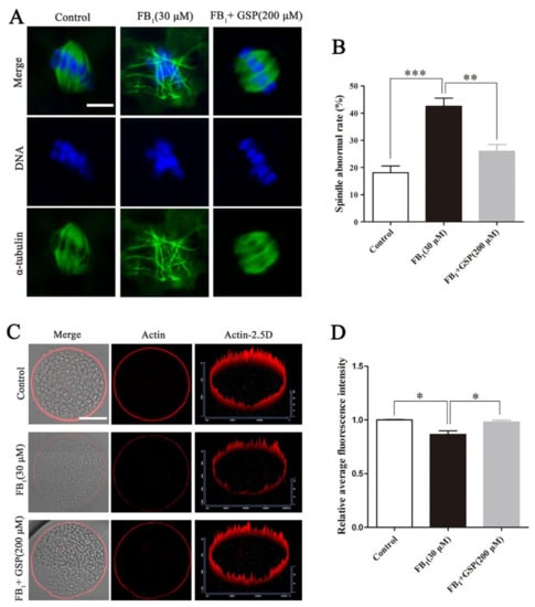 As shown in Figure 2, most oocytes in the control group showed regular α-tubulin morphology and chromosome alignment along the metaphase plate to assemble into typical metaphase spindles. In contrast, the proportion of oocytes with aberrant α-tubulin and misaligned chromosomes in the FB1-exposed group (42.50 ± 2.59%) was prominently higher than that in the control group (18.13 ± 2.15%, p < 0.001, Figure 2B). However, GSP cotreatment observably reduced the proportion of FB1-exposed oocytes with spindle assembly defects to 25.98 ± 2.17 (p < 0.01). Moreover, as shown in Figure 2C,D, the analysis of relative average fluorescence intensity confirmed that the actin signals in FB1-exposed oocytes were strikingly decreased compared with those in the control group (0.866 ± 0.027 vs. 1.000 ± 0.004, p < 0.05), while the actin signals were significantly enhanced after GSP cotreatment (0.866 ± 0.027 vs. 0.980 ± 0.014, p < 0.05). There was no statistical difference in spindle assembly and actin distribution between the control and GSP cotreatment groups. These results demonstrate that GSP could rescue meiotic defects by protecting spindle structure and actin distribution in FB1-exposed oocytes.