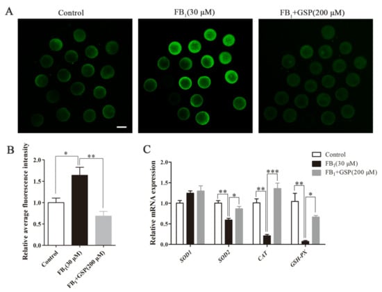 To further determine whether GSP could alleviate oxidative stress damage in FB1-exposed porcine oocytes, 100 oocytes in each group were treated with 0, 30 μM FB1 and 30 μM FB1 + 200 μM GSP for 44 h, ROS generation was evaluated by DCFH-DA staining. In addition, the transcriptional levels of CAT, SOD1, SOD2 and GSH-PX genes were analyzed by qRT-PCR.