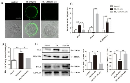Effect of GSP on the early apoptosis in FB1-exposed oocytes. (A) Typical fluorescent images of Annexin-V-FITC-stained oocytes from the control, 30 μM FB1-exposed and FB1+200 μM GSP cotreatment groups. Scale bar, 50 μm; green, Annexin-V-FITC. (B) The rate of the oocytes that exhibited apoptotic positive signals in control (n = 101), 30 μM FB1-exposed (n = 100) and FB1+200 μM GSP cotreatment oocytes (n = 101). (C) The mRNA expression levels of BAX, BCL2 and CASPASE3 genes in oocytes from the control, 30 μM FB1-treated and FB1+200 μM GSP groups. (D) The protein expression of BAX and BCL2 in oocytes from the control, 30 μM FB1-exposed and FB1+200 μM GSP cotreatment groups. Three replicates were performed and results are expressed as the mean ± SE. The letter “n” means the total number of oocytes in each group of 3 independent replicates. Significant difference: * p < 0.05 was considered significant; ** p < 0.01 was considered highly significant; *** p < 0.001 was considered very significant.