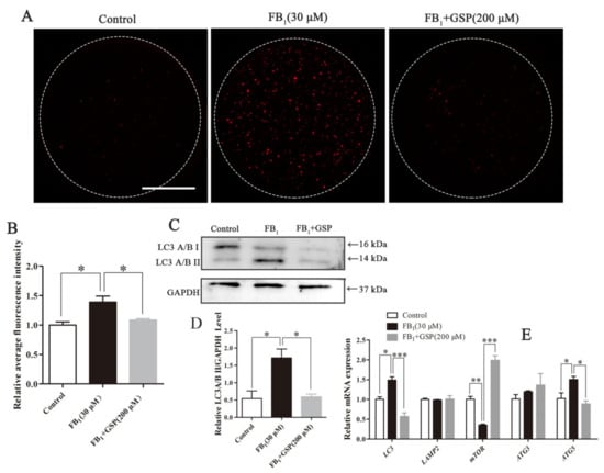 Effect of GSP on the autophagy of FB1-exposed oocytes. (A) Typical fluorescent images of LC3A/B-staining in oocytes from the control, 30 μM FB1-exposed and FB1+200 μM GSP cotreatment groups. Scale bar, 50 μm; red, LC3A/B. (B) Relative average fluorescence intensity of LC3A/B in oocytes from the control (n = 57), 30 μM FB1-exposed (n = 59) and FB1+200 μM GSP cotreatment groups (n = 58). (C) and (D) The protein expression of LC3A/B in oocytes from the control, 30 μM FB1-exposed and FB1+200 μM cotreatment GSP groups. (E) The mRNA expression levels of LC3, LAMP, mTOR, ATG3 and ATG5 genes in oocytes from the control, 30 μM FB1-exposed and FB1+200 μM GSP cotreatment groups. Three replicates were performed and results are expressed as the mean ± SE. The letter “n” means the total number of oocytes in each group of 3 independent replicates. Significant difference: * p < 0.05 was considered significant; ** p < 0.01 was considered highly significant; *** p < 0.001 was considered very significant.