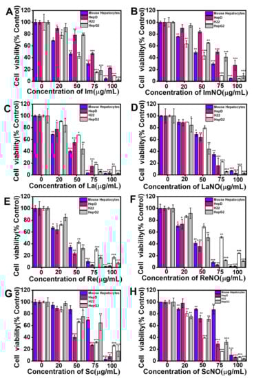 Im, ImNO, La, LaNO, Re, ReNO, Sc and ScNO inhibited the growth of primary mouse hepatocytes, human hepatocytes (HepD), mouse hepatoma-22 (H22) and human hepatocellular carcinoma (HepG2) cells. The proliferative ability of primary mouse hepatocytes, HepD cells, H22 cells and HepG2 cells was detected using cell counting kit-8 assays after the cells were treated with Im, ImNO, La, LaNO, Re, ReNO, Sc and ScNO. (A) The viability of four kinds of cells after treated by Im. (B) The viability of four kinds of cells after treated by ImNO. (C) The viability of four kinds of cells after treated by La. (D) The viability of four kinds of cells after treated by LaNO. (E) The viability of four kinds of cells after treated by Re. (F) The viability of four kinds of cells after treated by ReNO. (G) The viability of four kinds of cells after treated by Sc. (H) The viability of four kinds of cells after treated by ScNO. Data represent means ± standard deviation (S.D.) of three independent experiments. *: p < 0.05, **: p < 0.01 and ***: p < 0.001 compared with the control group.