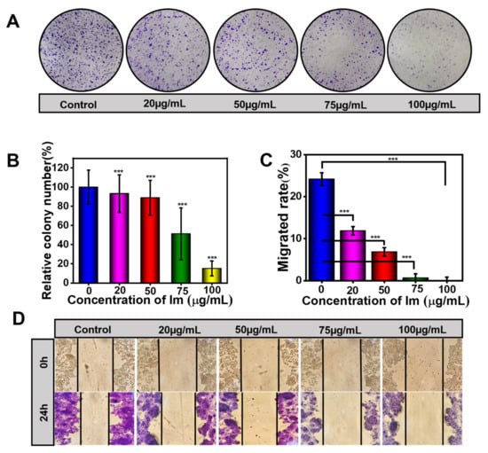 The wound-healing assay was also performed to assess the migration ability of HepD cells after treatment with Im. As shown in Figure 3C,D, the relative distance of cell migration reflected the viability of cells, and Im inhibited the capability of HepD cells in migration. Compared with the initial width, Im at 0, 20, 50, 75 and 100 μg/mL, the relative widths of the wounds were 75.83%, 88.13%, 93.13%, 99.38% and 99.90%, respectively. These data revealed that the migration ability of HepD cells was completely lost when exposed to Im at 100 μg/mL. Taken together, these results showed that Im inhibited colony formation and migration of HepD cells, which further demonstrated the cytotoxic effects of Im on cells.