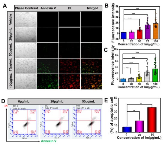 Im-induced HepD cells apoptosis. (A) The Annexin V/PI fluorescent images of cells treated with Im (0, 20, 50, 75 and 100 µg/mL) for 24 h (the early apoptotic cells are in green color, and the late apoptotic cells are in green and red color). (B) Quantitative statistics of the green fluorescence intensity corresponding to A. (C) Quantitative statistics of the red fluorescence intensity corresponding to A. (D) HepD cells were exposed to various concentrations of Im (0, 20 and 50 µg/mL) for 24 h, followed by flow cytometry-based apoptosis assay. (E) Group data analysis of the percentage of apoptotic cells corresponding to D. Data represent means ± S.D. of three independent experiments. **: p < 0.01 and ***: p < 0.001 compared with the control.