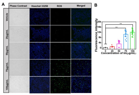 Im-induced ROS production in HepD cells. (A) The production of intracellular ROS levels was detected with DCFH-DA (ROS-positive cells are in green) and the nucleus was stained with Hoechst 33258 (nucleus are in blue). HepD cells were incubated with 0, 20, 50, 75 and 100 µg/mL Im for 24 h and the intensity of green fluorescence increased significantly as the concentration of Im increased. (B) Quantitative statistics of ROS fluorescence intensity corresponding to A. Data represent means ± S.D. of three independent experiments. ***: p < 0.001 compared with the control.