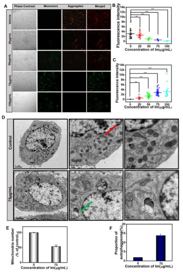 From the TEM images, we found that the nucleus volume of the Im-treated cells increased in size, the cytoplasm shrunk, the mitochondria formed a cup-shaped structure and the isolation membrane expanded into a spherical shape to form autophagosomes (Figure 6D). In contrast, in the control group, mitochondria were mostly slender and had obvious ridges. In addition, compared with the control group, the number of mitochondria decreased significantly in cells treated with 75 µg/mL Im, and a large number of mitochondrial autophagy was observed (Figure 6E,F).
