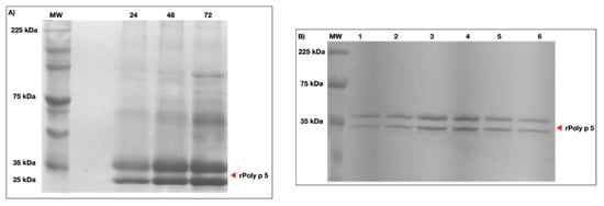 (A) Supernatant from P. pastoris X-33 culture in the course of rPoly p 5 expression protein profile on SDS-PAGE (12%). Abbreviations: 24–72 h after induction; (B). Purification of the recombinant allergen rPoly p 5 by affinity chromatography on Ni-NTA agarose and analysis by SDS-PAGE 12%. (M): Broad-range protein molecular weight markers (A): 1-6: rPoly p 5 samples eluted from Ni-NTA column with 75 mM Imidazole.