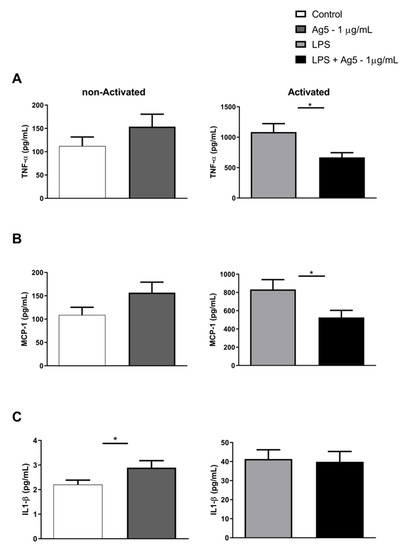 In Figure 3, we can observe a reduction in the TNF-α (Panel A) and MCP-1 (Panel B) cytokines production in activated macrophages treated with rPoly p 5 compared with their respective control. In contrast, we observed an increase in IL-1β cytokine secretion when the culture was treated only with rPoly p 5, without the addition of LPS. Figure 4, panels A and B, show an increase in the production of IL-6 and IL-10 cytokines, though not significant, was submitted to 1 μg/mL of rPoly p 5, without the addition of LPS. However, the results found did not show differences compared to unstimulated controls. On the other hand, IL-1α, IL-12p70, IL-17A, IL-23, IL-27, IFN-β, and GM-CSF cytokines showed no significant changes when cultures were stimulated with rPoly p 5 compared to their respective control group, as shown in Figure S1 of Supplementary Material.