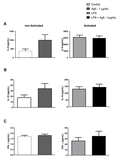 Effect of rPoly p 5 on cytokine production by intraperitoneal macrophages stimulated with rPoly p 5: (A) IL-6, (B) IL-10, (C) IFN-γ. The bars represent the mean ± (S.E.M) of cytokine concentrations detected in the cell cultures supernatants of BALB/c mice intraperitoneal macrophages stimulated with the proinflammatory stimulus (LPS at 1 μg/mL—light gray and black bars), or that received no stimulus (white and dark gray bars). Concomitantly with the addition of this stimulus, the cells were incubated with rPoly p 5 at a concentration of 1 μg/mL for 48 h (dark gray and black bars), and the controls received only cell culture medium (white and light grey bars). (N = 44). Please see the cytokines that showed no significant changes in Figure S1 of Supplementary Material.
