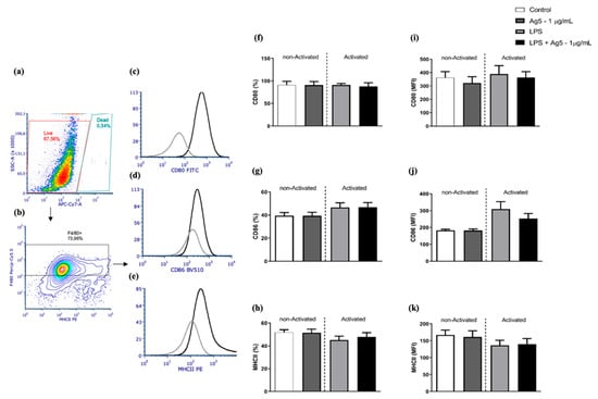 (a–k). Expression and frequency of positive cells expressing the co-stimulatory molecules CD80, CD86, and MHCII by intraperitoneal macrophages stimulated with rPoly p 5. The graphs (a–e) represent the flow cytometry assay gate strategy used. The panel (a), showing SSC-A vs APC-Cy7 (viability probe), was used to determine the populations of viable cells (red gate) and dead cells (blue gate). The intraperitoneal macrophages (F4/80+ cells—black gate) were identified in the contour plot of panel (b) by plotting PercP-Cy5.5 channel (F4/80) and PE channel (MHCII). The black lines in the histograms of the panels (c–e) represent the counts vs. the fluorescence intensity of the markers CD80, CD86, and MHCII, respectively. The grey lines are the measurement of their respective isotype controls. Panels (f–h) represent the mean ± (S.E.M) of the frequency of positive cells to CD80, CD86, and MHCII markers, respectively. Panels (i–k) represent the mean ± (S.E.M) of the median of the fluorescence intensity of the fluorochromes conjugated to the monoclonal antibodies triggered to CD80, CD86, and MHCII, respectively. The light grey and black bars represent cell cultures of BALB/c mice intraperitoneal macrophages which were stimulated with the proinflammatory stimulus (LPS at 1 μg/mL) and the white and dark grey bars represents cell cultures that received no stimulus. Concomitantly with the addition of this stimulus, the cells were incubated with rPoly p 5 at a concentration of 1 μg/mL for 48 h (dark grey and black bars), and the controls received only cell culture medium (white and light grey bars). The analyzes were performed in viable F4/80+ cells, as represented in the gate strategy. (N = 17).