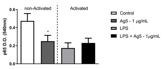 The expression of the phosphorylated form of the p65 subunit of NF-kB was evaluated by ELISA assays in LPS-activated or non-activated intraperitoneal macrophages in the absence/presence of rPoly p 5. The results in Figure 6 show that there was a decrease in the production of the phosphorylated form of the p 65 subunit of NF-kB in the macrophage nucleus, when non-activated macrophages cultures were treated with the recombinant allergen rPoly p 5. However, no significant change was observed concerning the LPS-activated group, when treated with 1 μg/mL of rPoly p 5.