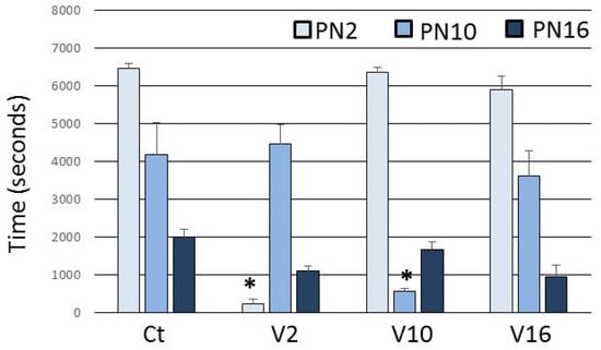 Time spent in arched-back nursing posture after the treatment. Ct injected with 0.9% NaCl in PN2, PN10 and PN16. V2 injected with T. serrulatus venom in PN2 and 0.9% NaCl in PN10 and PN16. V10 injected with T. serrulatus venom in PN10 and 0.9% NaCl in PN2 and PN16. V16 injected with T. serrulatus venom in PN16 and 0.9% NaCl in PN2 and PN10. (n = 6 females per group). Data are expressed as means ± SEM. (*) p < 0.001 compared to the control group (Two-way ANOVA).