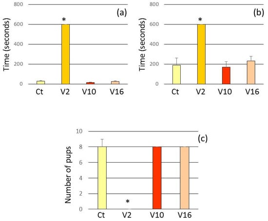 In the V2 group, dams that failed to group the litter during the test period demonstrated higher latencies to retrieve pups. In V10 and V16 groups, the mothers behaved similarly to the control group (Figure 2).