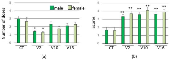 Assessment of seizure threshold (n = 6 females and 6 males per group). (a) Number of doses needed to reach the seizure threshold. (b) Average intensity of seizure behavior. Data are expressed as means ± SEM. (*) p < 0.01 and (**) p < 0.05 compared to the control group (Kruskal Wallis test).