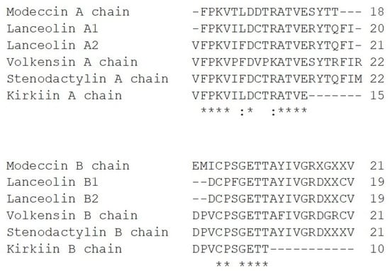 Amino acid alignment of the N-terminal sequences of modeccin, lanceolin, stenodactylin, volkensin, and kirkiin. Identical residues (*), conserved substitutions (:) are reported. X, unassigned amino acid positions [15].