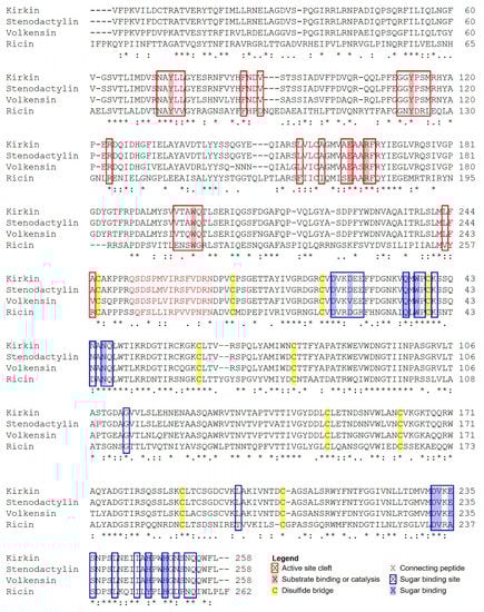 Alignment between kirkiin, stenodactylin (GenBank MT580807), volkensin (GenBank CAD61022), and ricin (GenBank P02879). Identical residues (*), conserved substitutions (:), and semiconserved substitutions (.) are reported. The A and B chains are written in black letters; the sequence of the linker peptide is in red. The putative amino acids that are present in the active site pocket (boxed in red) or in the galactoside-binding sites (boxed in blue), those involved in substrate binding or catalysis (highlighted in red), those involved in sugar binding (highlighted in blue), and those involved in disulfide bridges (highlighted in yellow) are represented, and they were assigned by comparison with the structure of ricin (PDB accession no. 2AAI, 3RTI, and 3RTJ). The dash indicates a gap introduced into the sequences to maximize alignments.