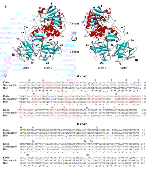 Structure of kirkiin. (a) Three-dimensional structure of kirkiin. The three-dimensional structural modeling was carried out on the I-TASSER server, and the figure was generated using Discovery Studio 2016. The α helices (red), the β chains (cyan), and the coils (gray) are represented. Arrows indicate the position of the disulfide bond linking A and B chains. (b) Amino acid sequence alignment of the A and B chains of kirkiin, stenodactylin, and ricin [22]. The strands (blue), the helices (red), and the cysteines involved in the disulfide bonds (highlighted in yellow) are indicated. The helices are labeled from A to I, and the strands of the β sheets are labeled from a to h in the A chain. The structural subdomains in the B chain are also indicated. Identical residues (*), conserved substitutions (:), and semiconserved substitutions (.) are reported.