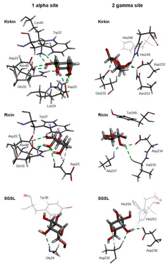 As shown in Figure 5, the amino acids involved in D-galactose binding at the 1α site of ricin are conserved in kirkiin, and the way D-galactose binds is very similar in both proteins. In both cases, the binding of β-D-galactopyranose is the result of the C–H–π interaction between the aromatic ring of Trp37 and the apolar face of the pyranosic ring of galactose. The polar groups of the polar face of galactose form hydrogen bonds with the amino acids Asp22, Asp25, Gln35, and Asn46, and, in the case of kirkiin, the hydrogen bonds can also be formed with Lys24 and Lys40. In snake gourd seed lectin (SGLS), a non-toxic type 2 RIP obtained from seeds of Trichosanthes cucumerina L. (= Trichosanthes anguina L.), the apolar face of the pyranosic ring of galactose binds to the aromatic ring of Tyr36, while the polar face forms hydrogen bonds with the amino acids on the other side of the pocket of the 1α site, mainly with Gly24 [24] (Figure 5).