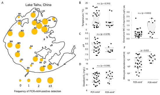 This is a (A) Large-scale spatial distribution of mlr-genotype (measured by the frequency of positive PCR-mlrA detection) in Lake Taihu from November 2008 to March 2009. (B–F) Notched box plots showing the difference in the five parameters (temperature, pH, dissolved O2, extracellular microcystin, and Microcystis abundance) between negative PCR-mlrA (PCR-mlr-) and positive PCR-mlrA (PCR-mlrA+) group (Two-sample t-test, n.s., not significant, p > 0.05).