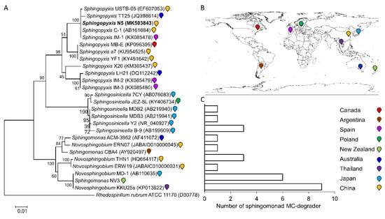 (A)16S rRNA-based phylogenetic analysis of the newly isolated indigenous MC degrader Sphingopyxis N5 (in bold) in northern Lake Taihu against 25 MC-degrading sphingomonad strains previously identified, Rhodospirillum rubrum ATCC 11170 was chosen as the outgroup. Local bootstrap probabilities were indicated at nodes. The access number for each strain’s 16S RNA was shown in brackets. The color-coding mark beside each bracket was used to indicate each strain’s origin. (B) The origin of the 26 microcystin-degrading sphingomonad strains. (C) The bar chart summarizing the number of the identified MC-degrading sphingomonad isolates in each country (China, Japan, Thailand, Spain, Poland, Canada, Argentina, Australia, New Zealand) across the Asia, Europe, North America, South America, and Oceania.