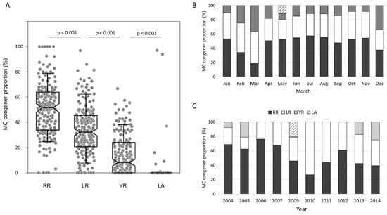 Meta-analysis of the composition pattern of microcystin congeners (LR, RR, YR, and LA) in northern Lake Taihu. (A) Box plot of the proportion values (%) of four microcystin variants (LR, RR, YR, and LA) in northern Lake Taihu according to the meta-analysis. (B) Temporal variation in the proportions of LR, RR, YR, and LA in northern Lake Taihu over 11 years (2004–2014), according to the meta-analysis. (C) Temporal variation in the proportions of LR, RR, YR, and LA in northern Lake Taihu over 12 months.
