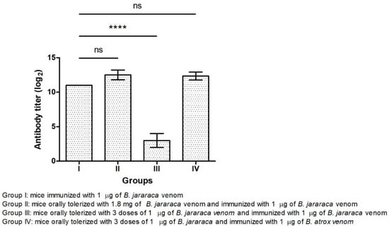 Induction of oral tolerance by administration of B. jararaca venom evaluated by antibody titer of mouse antiserum after immunization. Group I was not subjected to oral tolerance. The mice were orally tolerized with a single high dose of venom (Group II) or with low doses of venom on the first, third and fifth day (Group III and IV). Twelve days after receiving the last oral dose, Groups I, II and III were immunized with B. jararaca venom, and group IV received B. atrox venom. Serum antibody titers corresponding to 35 days after immunization were determined by ELISA. Error bars represent the standard deviation of an experiment (n = 3). ANOVA with 95% confidence intervals was used to determine significant differences between each group of mice. ns: not significant; ****: p-value was <0.0001.