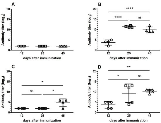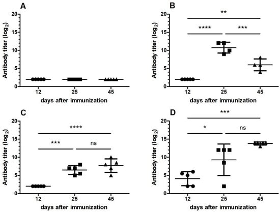 Antiserum specificity for B. jararacussu venom from mice subjected or not to oral tolerance followed by immunization with snake venom. Microplate wells were coated with 1 µg of B. jararacussu venom, and serial dilutions of antiserum of Groups I–IV corresponding to 12, 25 and 45 days after snake venom immunization were applied; antibody titer was determined by ELISA. (A) Group I: mice tolerized with B. jararaca venom and immunized with the same snake venom; (B) Group II: mice immunized with B. jararaca venom; (C) Group III: mice tolerized with B. jararaca venom and immunized with B. jararacussu venom; (D) Group IV: mice immunized with B. jararacussu venom. The mean and standard deviation (n = 5) of each antibody titer obtained were plotted. ANOVA with 95% confidence intervals was used to determine significant differences between each mice group. ns: not significant; *: p-value was 0.01–0.05; **: p-value was 0.001–0.01; ***: p-value was 0.0001–0.001; ****: p-value was <0.0001.