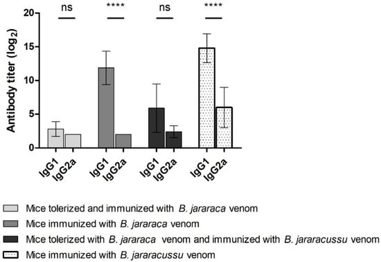 IgG1 and IgG2a antibody titers of groups of mice subjected to oral tolerance induction with B. jararaca venom followed by immunization. Microplate wells were coated with 1 µg of B. jararaca venom, and serial dilutions of Groups I-IV antiserum, as previously described in “Section 4”, corresponding to 45 days after immunization with snake venom, were applied; antibody titer was determined by ELISA using mouse anti-IgG1 or anti-IgG2a antibodies conjugated to HRP. Error bars represent the standard deviation of one experiment (n = 5). 2-way ANOVA with 95% confidence intervals was used to determine significant difference between IgG1 and IgG2a antibody titers for each group. ns: not signigficant; ****: p-value was < 0.0001.