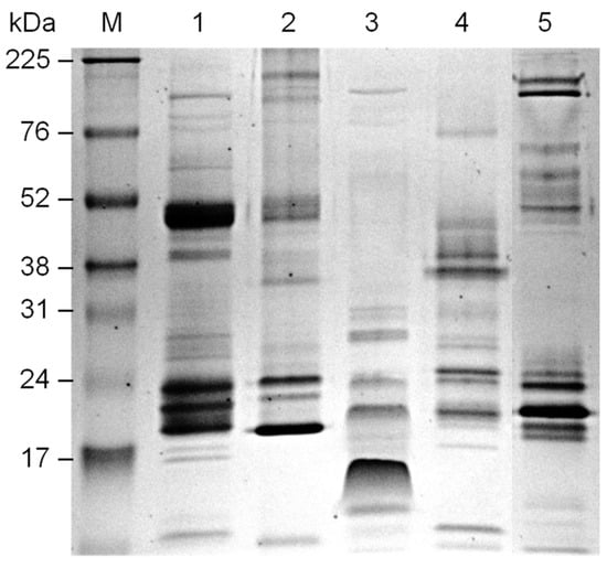 Electrophoretic profiles of snake venoms under non-reducing conditions. 12% SDS-PAGE of 5 µg of each snake venom. Coomassie blue staining. M: Rainbow marker high range (Cytiva); snake venom from 1: B. jararaca; 2: B. alternatus; 3: B. jararacussu; 4: B. atrox amazonia; 5: Bitis anetans.