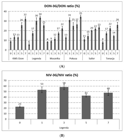 DON3G/DON (A) and NIV3G/NIV (B) molar ratios (%) at distinct stages of the malting process of grain of six wheat cultivars. (The days of malting: “0”—raw grain, “1”—grain after steeping, “3”—grain after 48 h of germination, “5”—grain after 96 h of germination, “7”—grain after 144 h of germination (finished malt). Abbr.: DON—deoxynivalenol, DON-3G—deoxynivalenol-3-glucoside, NIV—nivalenol, NIV-3G—nivalenol-3-glucoside. Error bars represent standard deviations of the values.