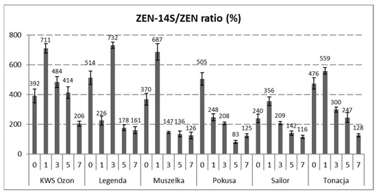 ZEN-14S/ZEN molar ratio (%) at various stages of the wheat grain malting process. The days of malting: “0”—raw grain, “1”—grain after steeping, “3”—grain after 48 h of germination, “5”—grain after 96 h of germination, “7”—grain after 144 h of germination (finished malt). Abbr.: ZEN—zearalenone, ZEN-14S—zearalenone-14-sulfite. Error bars represent standard deviations of the values.