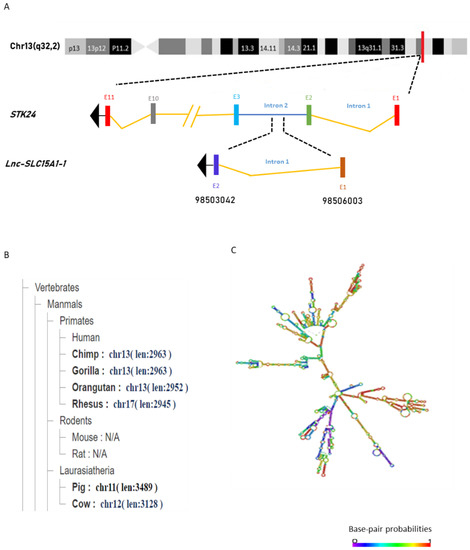 From the information in the NONCODE database (http://www.noncode.org/, accessed on 25 December 2019), we found that lnc-SLC15A1-1 is located on chromosome 13 (q32.2) and transcribed from part of STK24’s intron 2 in the anti-sense strand. It consists of 1795 nucleotides, with two exons (Figure 2A). Phylogenetic analysis showed that lnc-SLC15A1-1 is well conserved across species, including primates and laurasiatheria, but is located in different chromosomes. Lnc-SLC15A1-1 in chimpanzees, gorillas, and orangutans is located on chromosome 13, like humans, but is on chromosome 17 in Rhesus monkeys, chromosome 11 in pigs, and chromosome 12 in cows (Figure 2B). However, the function of lnc-SLC15A1-1 has not been mentioned in the literature. Figure 2C shows the predicted minimum free energy secondary structure of lnc-SLC15A1-1, which was provided by RNAfold network (http://rna.tbi.univie.ac.at//cgi-bin/RNAWebSuite/RNAfold.cgi, accessed on 4 May 2020). This secondary structure is composed of highly probable base pairs and annotated in different colors representing the probability of base pairing.