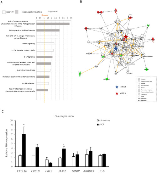 Ingenuity Pathway Analysis of differentially expressed genes regulated by lnc-SLC15A1-1. (A) Canonical pathways of differentially expressed genes regulated by lnc-SLC15A1-1. Vertical orange line indicates the default threshold. The gray bars indicate no activity pattern. (B) Representative network of downstream genes regulated by lnc-SLC15A1-1. Red and blue stars indicate CXCL10 and CXCL8, respectively. Green color indicates downregulation, and red color indicate upregulation. Solid lines represent direct interaction (yellow), and dashed lines represent indirect interaction. Various shapes representing the functional class of the gene product. (C) Quantitative RT-PCR analyses of top 10 differentially expressed genes identified by microarray. Loading control: GAPDH. Experiments were repeated in triplicate, and the results are the mean ± SDs. (* p < 0.05).