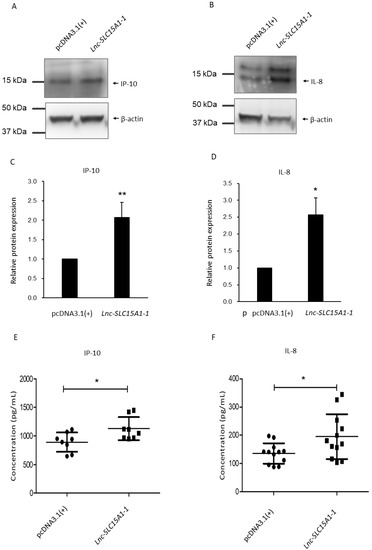 Upregulation of IP-10 and IL-8 in HUVECs overexpressing lnc-SLC15A-1. (A,B) Total lysates from HUVECs transfected with 1.5 μg of lnc-SLC15A1-1 expression plasmid or empty vector (pcDNA3.1(+)) were analyzed by Western blotting. Loading control: β-actin. (C,D) Quantitative results of Western blotting. Analysis and quantification of Western blotting results of IP-10 and IL-8. Data are the means ± SDs (n = 3; * p < 0.05, ** p < 0.01). (E,F) Enzyme-linked immunosorbent assay (ELISA) of IP-10 and IL-8 in conditioned medium. Culture medium of HUVECs with/without overexpression of lnc-SLC15A1-1 was collected, followed by ELISA application. All data shown are the means ± SDs (* p < 0.05).