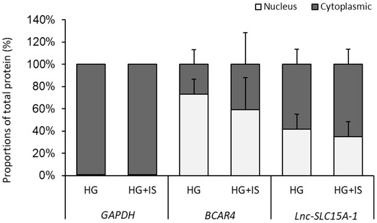 To investigate the mechanism by which lnc-SLC15A1-1 upregulates CXCL10 and CXCL8, we examined the distribution of lnc-SLC15A1-1 in HUVECs overexpressing lnc-SLC15A1-1 and treated with HG or HG + IS by cytoplasmic and nuclear fractionation. Around 60–70% of lnc-SLC15A1-1 was located in the cytoplasm (Figure 6), indicating that lnc-SLC15A1-1’s upregulation of CXCL10 and CXCL8 may be via miRNA sponging, i.e., binding and sequestration of specific miRNA transcripts.