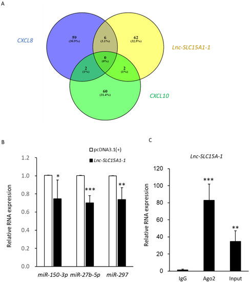 Lnc-SLC15A1-1 functions as a miRNA sponge. (A) Venn diagram of miRNAs predicted to interact with lnc-SLC15A1-1, CXCL10, and CXCL8. MiRNAs were predicted by miRDB (http://mirdb.org/index.html, accessed on 17 December 2020). (B) Relative expression levels of three predicted miRNAs. The expression levels of miRNAs in HUVECs overexpressing lnc-SLC15A1-1 or empty vector (pcDNA3.1(+)) were detected by quantitative RT-PCR and normalized to U6. Data are the means ± SDs (* p < 0.05, ** p < 0.01, and *** p < 0.001). (C) RNA immunoprecipitation (RIP) analysis of lnc-SLC15A1-1 using antibody against Argonaute-2 (AGO2) in HUVECs. The RIP enrichment of the AGO2-associated lncRNA was measured by quantitative RT-PCR and normalized to U6. The relative fold enrichment was calculated as compared to the IgG group. Data are the means ± SDs (n = 5 and ** p < 0.01, *** p < 0.001).