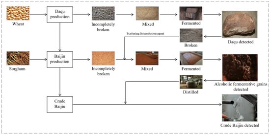 The production technology of soy sauce aroma-type baijiu is complicated and contains processes of fermentation, distillation and storage [14,15]. Typically, wheat is broken down—incompletely at first—and mixed with water and a ripe starter for inoculation. The mixed raw materials are made into a square block, which then undergoes stacking and fermentation processed, at a high temperature. The product obtained, after complete fermentation, is called daqu. daqu is rich in glucoamylase, which can decompose starch in the alcoholic fermentative grains into sugar. Sugar is then transformed into alcohol by yeast. Finally, crude baijiu is obtained by distilling alcoholic fermentative grains. Thus, the process of soy sauce aroma-type baijiu production includes the critical steps of wheat, daqu, alcoholic fermentative grains, and crude baijiu (Figure 1). Through the hazard analysis critical control point (HACCP) quality management system [16], the potential mycotoxic hazard risks of the critical control point in baijiu production can be analyzed.