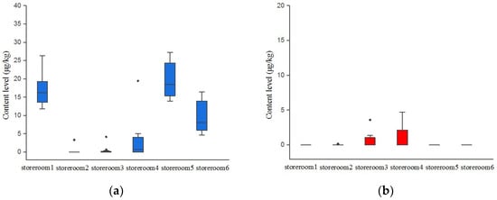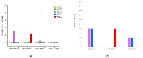 Daqu is a traditional fermentation starter of soy sauce aroma-type baijiu made of wheat and used throughout the fermentation process of making baijiu [15,30]. Thus, it is the essential material for soy sauce aroma-type baijiu production. In this paper, daqu was also the critical monitoring point because it was fermented spontaneously under high temperatures and may be contaminated by mycotoxins [20]. We preliminarily tracked AFs and OTA concentration levels of daqu samples in six storerooms by the ELISA method (Figure 2). Among the six storerooms, storerooms 1, 4, 5 and 6 were contaminated by AFs. Storerooms 1, 5 and 6 had the highest detection rates of AFs (100%), with concentrations of 11.8–26.4 µg kg−1, 14.0–27.3 µg kg−1 and 4.7–16.5 µg kg−1, respectively. It was also noticed that OTA detection was only positive in storerooms 3 and 4, with an average content below 5 μg/kg that agreed with the daqu OTA values of from a previous study [20]. In general, it can be observed clearly that the positive rates and content level of AFs were higher than OTA in daqu samples, reflecting a comparatively higher potential risks of AFs contamination in daqu. Similar results were detected by Li et al., namely that the OTA content of two daqu samples was 1.4 and 1.6 μg/kg, while AFB1 was 2.5 and 2.6 μg/kg, respectively [31].