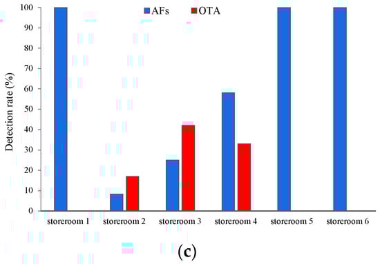 (a) Distribution of AFs content level in daqu samples detected by ELISA; (b) Distribution of OTA content level in daqu samples detected by ELISA; (c) detection rate (n%) of AFs and OTA in daqu samples.