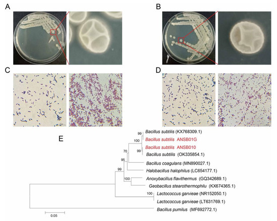 Colony characteristics of ANSB010 (A) and ANSB01G (B); cell (left) and spore (right) morphology of ANSB010 (C) and ANSB01G (D), scale bar, 100 μm; (E) the phylogenetic tree of Bacillus subtilis ANSB010 and ANSB01G, the GenBank accession numbers of sequences are shown in round brackets.