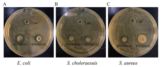 The antibacterial effects of probiotic Bacillus subtilis ANSB010 and biodegradable Bacillus subtilis ANSB01G on E. coli (A), S. choleraesuis (B) and S. aureus (C). E. coli, Escherichia coli; S. choleraesuis, Salmonella choleraesuis; S. aureus, Staphylococcus aureus. Con: MRS medium; ANSB010, probiotic Bacillus subtilis ANSB010; ANSB01G, biodegradable Bacillus subtilis ANSB01G.