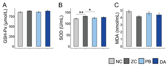 Comparison of serum levels of antioxidant parameters among different treatment groups. (A) GSH-Px, glutathione peroxidase; (B) SOD, superoxide dismutase; (C) MDA, malondialdehyde. NC, normal control diet group; ZC, ZEN-contaminated group; PB, probiotic Bacillus subtilis group; DA, biodegradable Bacillus subtilis group. *, p < 0.05; **, p < 0.01.
