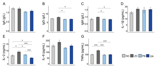 As shown in Figure 5, the levels of immunoglobulin G (IgG) and IgM in the PB and DA groups were dramatically lower than that of the ZC group (Figure 5B,C, p < 0.05). However, there was no significant difference in the levels of IgA (Figure 5A, p < 0.05). In addition, the levels of pro-inflammatory factors (e.g., interleukin 2 (IL-2) and tumor necrosis factor-α (TNFα)) in the serum of the ZC group was significantly higher than these of other groups (Figure 5E,G, p < 0.05). Additionally, the DA group had the lowest level of IL-2 (Figure 5E, p < 0.05). However, other pro-inflammatory factors (e.g., IL-1β and IL-6) were not significantly different (Figure 5D,F, p > 0.05).