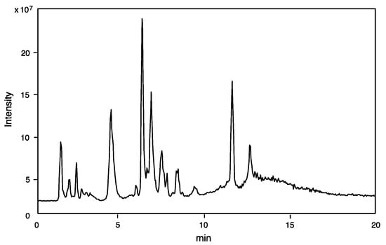 TIC profile from LC-ESI-MS of venom extracts of Campsomeriella annulata annulata by reverse-phase HPLC using CAPCELL PAK C18 (1.5 × 150 mm) with linear gradient of 5–65% CH3CN/H2O/0.1% formic acid over 20 min at flow rate of 200 μL/min.
