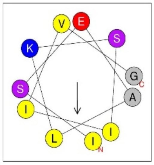 The third most intense, but rather minor peak at RT 8.57, Fr. 13 contained annulatin (m/z 1128.687, LSEALKSLLVG-NH2: where L = either L or I). The MALDI TOF/TOF spectrum of annulatin afforded d-ion peaks at m/z 786.2 (d8a), 800.2 (d8b), and 913.3 (d9b), and w-ion peaks at m/z 669.2 (w7) and 1083.6 (w11a), which indicated 1I, 7L, 8I, and 9I. Accordingly, the exact structure should be ISEALKSIIVG-NH2. It was confirmed by solid-phase synthesis of this peptide, and the HPLC and MS/MS comparisons of the synthetic specimens with the natural peptide. This peptide may belong to linear α-helical peptides since it can adopt amphiphilic α-helical secondary structure as shown in Figure 2. A large number of this type of peptides are found in natural sources, including arthropod venoms. In case of solitary wasp venoms, we already discovered several peptides of such a type (Table 8), but this is the first example found in scoliid wasp venom. Two other peptides, Ca-1281 (m/z 1281.875, FLLPLLKGLLVG-NH2: where L = either L or I) and Ca-1415 (m/z 1415.896, GLLTDLRKFLLK-NH2: where L = either L or I) may also be linear α-helical peptides, as they can be predicted to adopt α-helical secondary structure.