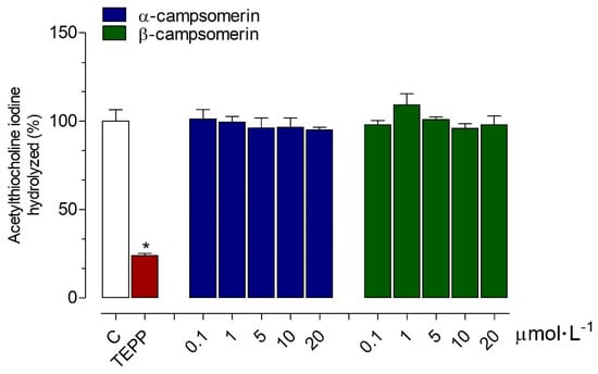 Inhibitory effects of α-campsomerin and β-campsomerin on the activity of acetylcholine esterase (AChE). The extent of AChE activity inhibition was expressed as a percentage of acetylthiocholine iodine substrate hydrolyzed in relation to control (C; blank box). Data from three independent experiments in triplicate are expressed as mean ± standard deviation, and evaluated using one-way ANOVA followed by Tukey’s post-test. * p < 0.05 for differences between the control groups; Tetraethyl pyrophosphate (TEPP; red box).