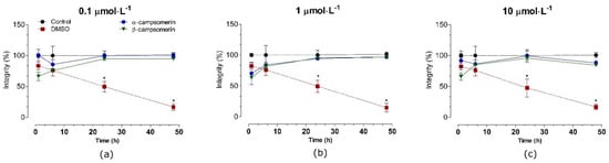 Toxicity of α-campsomerin or β-campsomerin on cell integrity in Vero cells. Cells were treated with peptides 0.1 μmol·L−1 (a), 1 μmol·L−1 (b) and 10 μmol·L−1 (c) for 1, 6, 12, 24, and 48 h. Control and DMSO groups represent cells without treatment and treated with DMSO 5%, respectively. Values are expressed as mean ± SD (n = 3 in triplicate) and analyzed by one-way ANOVA followed by Tukey’s post-test. * p < 0.05 in relation to the control group.
